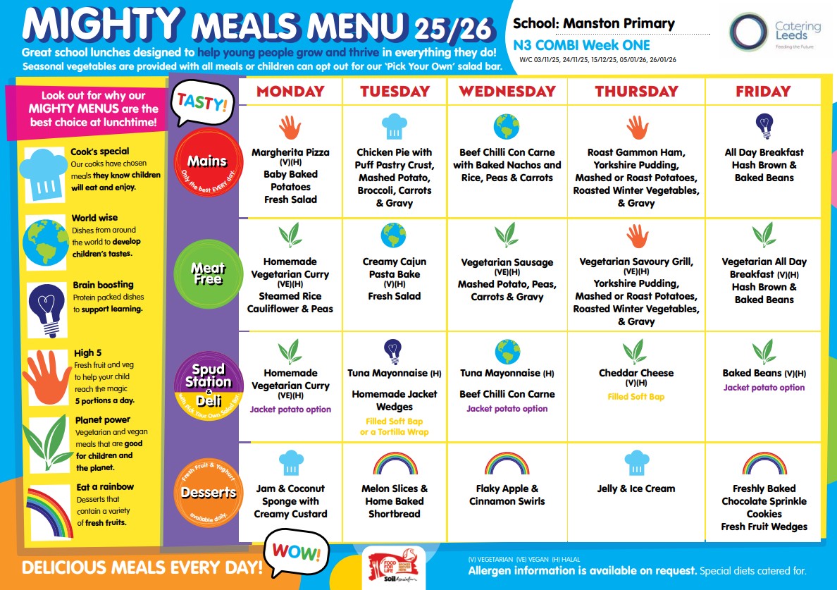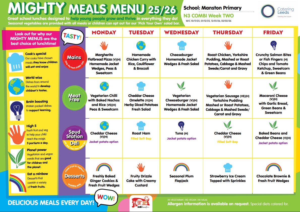 At Manston Primary, we promote healthy eating and provide a balanced, nutritious meal for every child who chooses a school dinner. Meals are prepared fresh each day by our experienced catering team and served in a calm, supportive dining environment.